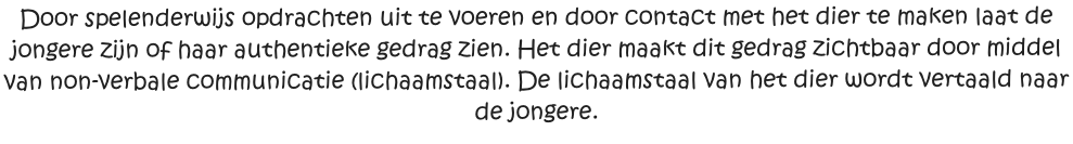 Individuele begeleiding en in kleine groepjes waarbij we opzoek gaan naar de talenten en kwaliteiten van het kind zelf en vooral niet in een kamertje zitten en praten. Maar buiten, nieuwe ervaringen opdoen, al doende leren over jezelf en daarna bruggetjes bouwen naar de moeilijke momenten.